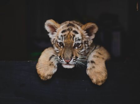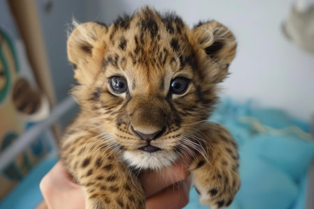 Closeup of a cute tiger cub being gently held, showcasing its innocence and playful eyes