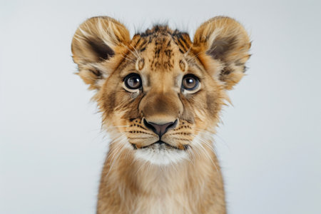 Lion cub with ears perked up, alert and curious, white backdrop, bright eyes, high-resolution, captivating gaze