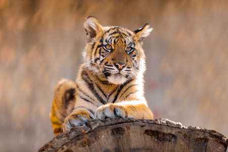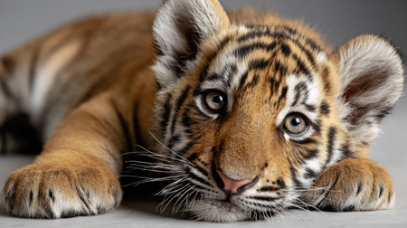 This captivating image showcases a young tiger cub resting with its striking orange fur and bold black stripes, exuding a playful charm and curiosity.