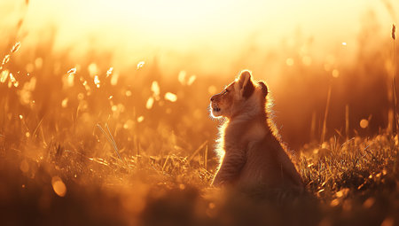 A young lion cub lying on the savannah, illuminated by warm golden sunlight