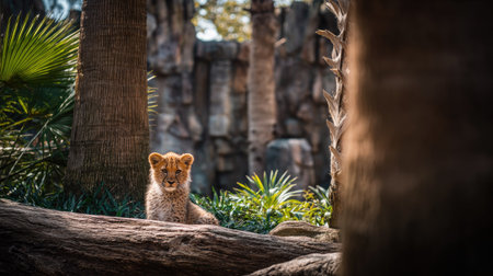 A young lion cub perches in a tree, observing its surroundings with curiosity and innocence, young animal standing at base of tree, AI Generated