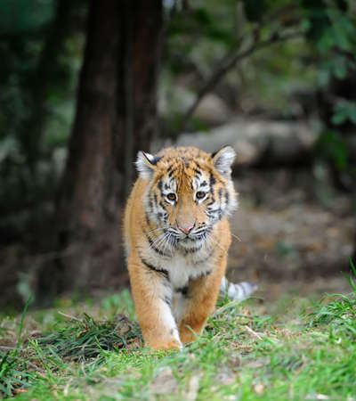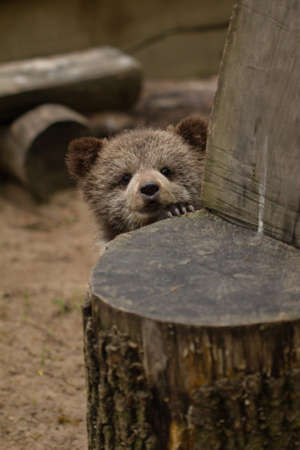 Little lion cub sitting on a log in the forest. Wildlife scene from nature.