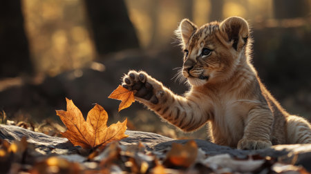 A baby lion cub playfully swatting at a fallen leaf, its curiosity shining through in the soft lighting.