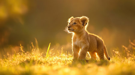A baby lion cub standing on a grassy knoll, bathed in golden sunlight with a peaceful background.