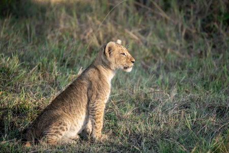 Lion cub sitting in the grass in the forest. Wildlife scene from nature.