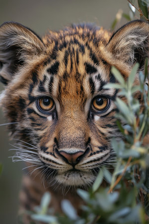 An adorable young lion cub displays its charming features in a captivating close-up. The enchanting eyes and playful expression highlight the beauty of wildlife in a natural setting.