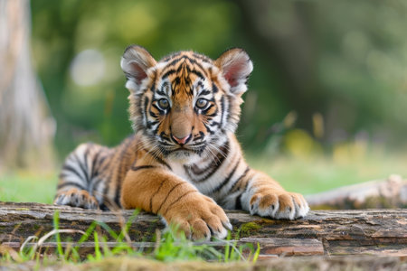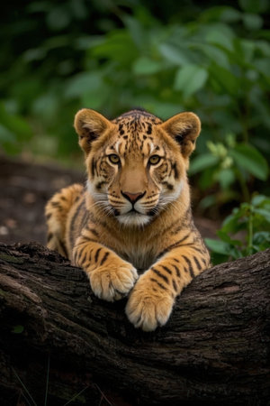 A young tiger cub relaxes on a log surrounded by vibrant greenery, showcasing its playful nature and distinct stripes under the warm sunlight.