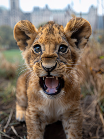 A close-up of a lion cub with its mouth wide open in a surprised yawn.