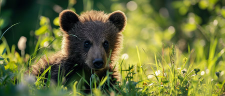 Captivating Young Brown Bear Cub in Sunlit Forest.