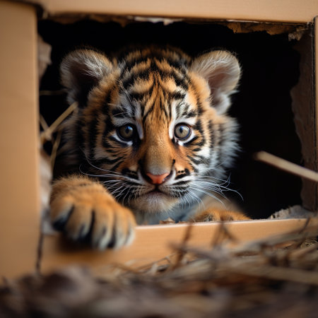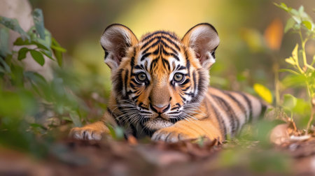 A Bengal tiger cub playing in the underbrush, its curious eyes wide open.