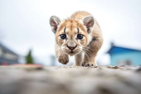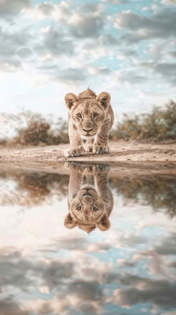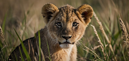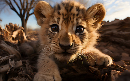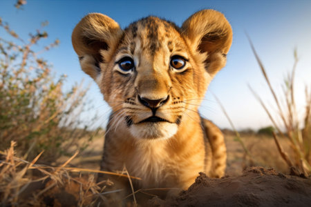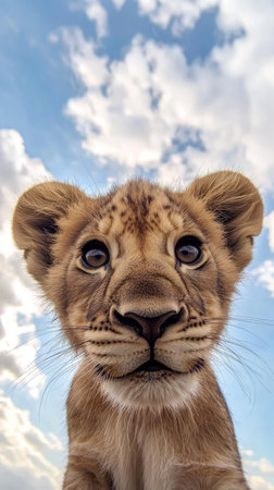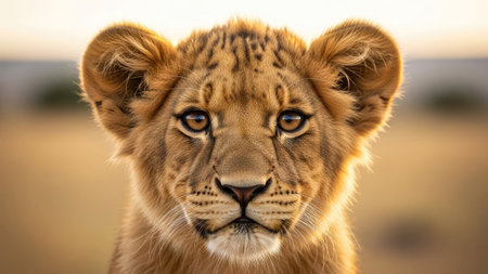 A striking close-up showcases a young lion cub, emphasizing its face and large, curious eyes. The warm tones of the fur contrast against a blurred background, suggesting an outdoor environment. This image is suitable for various commercial uses, including advertising and editorial content. The composition focuses on the subject's gaze.