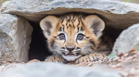 Close-up of a cute Amur leopard cub with big eyes, soft fur, and distinctive black spots, resting inside a rocky den.