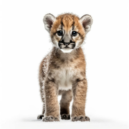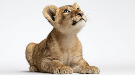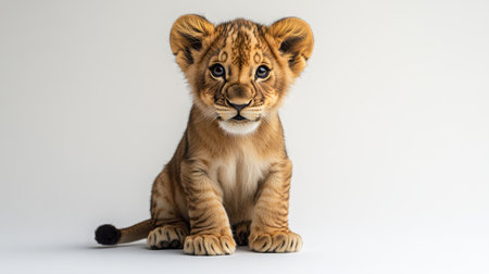 Adorable lion cub sitting on a white backdrop, big curious eyes, fluffy fur, playful expression, soft lighting, ultra-detailed, heartwarming vibe