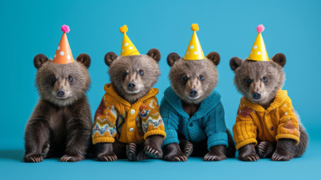 Adorable Baby Bear Surrounded by Colorful Wildflowers on a Bright Blue Background