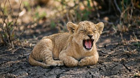 A lion cub rests on cracked earth, its mouth open in a yawn. Its eyes are squinted, and it is in a natural outdoor setting, looking adorable and tired.