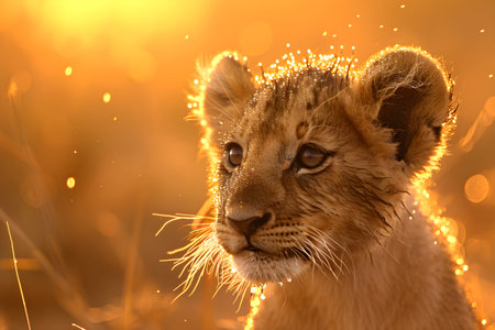 Lion cub in the golden light of sunset, Kruger National Park, South Africa