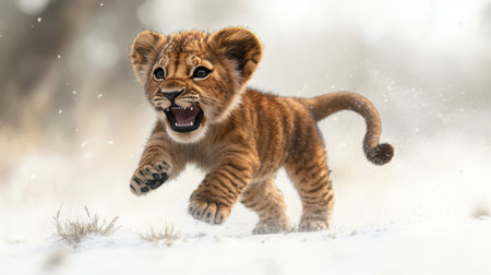 A baby lion cub hunting, running and jumping in snow, Generative AI