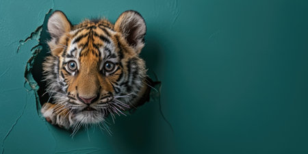 Close up view picture of the hollow green hole on the the wall that show the tiger stay inside the wall that has been made from some material yet still can be break to look through other side. AIGX03.