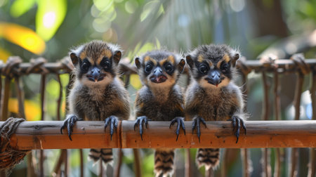 Three small fantasy creatures, mix of birds and lemur, sitting on a wooden pole with their beaks open, AI
