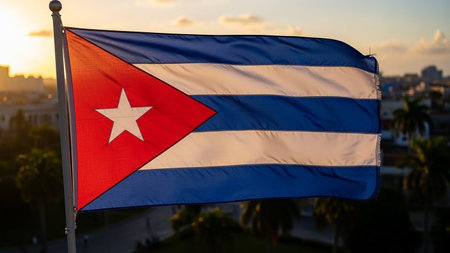 Dusk showing cuban flag waving on a flagpole at sunset with city skyline and palm trees keywords: cuba flag, national flag, caribbean country,...