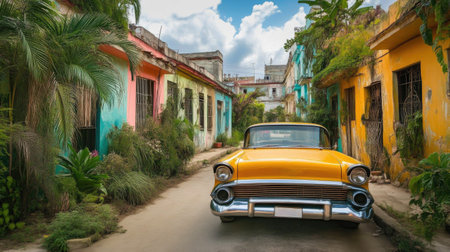 Historic Cuban Neighborhood Featuring Classic Limousine and Tropical Flora