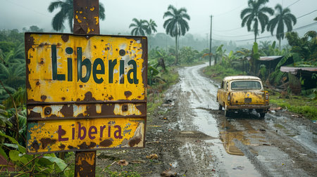 An old yellow taxi drives down a muddy road in Liberia, passing a weathered sign under a misty, rain-soaked landscape with lush greenery.