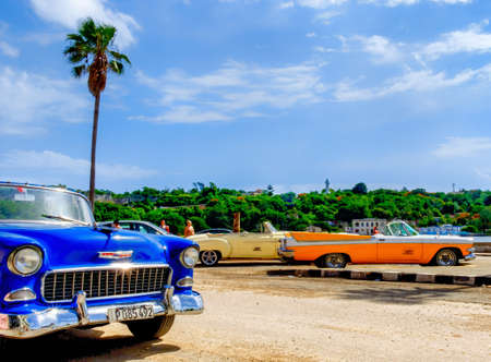 Havana, Cuba, July 2019, classic colourful 1950's American cars for rental parked in the old part of the capital