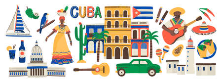 Collection of Cuba attributes isolated on white background - musical instruments, Cuban rum, flag, building, sombrero hat, chili pepper. Colorful vector illustration in modern flat cartoon style