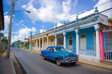TRINIDAD, CUBA - DECEMBER 16, 2019: Colorful houses and vintage cars in Trinidad, Cuba. Unesco World Heritage Site.