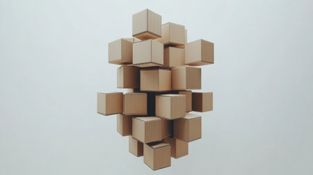 This striking abstract image features a dynamic arrangement of cardboard boxes in a 3D structure, emphasizing light and shadow interplay.