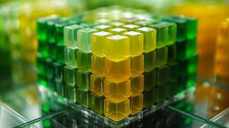 A textured green cube, divided into equal smaller cubes, presented on a dark grey background