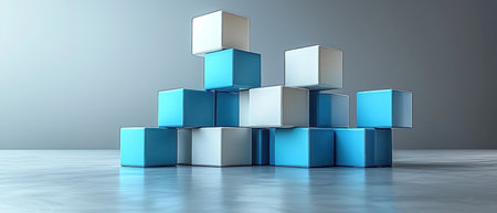 Abstract 3D rendering featuring a pyramid-like stack of blue and white cubes on a reflective surface, creating a modern, geometric composition with cool tones and clean lines.