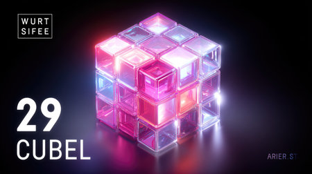A complex cubic structure composed of multiple translucent blocks is showcased against a dark background. The arrangement displays vibrant pink and blue hues. The image features a modern, clean composition with reflective surfaces. It is suitable for design, advertising, and conceptual projects.