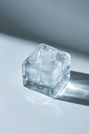 A single ice cube in focus, shimmering under a soft light, highlighting its smooth, transparent surface and frosty corners.