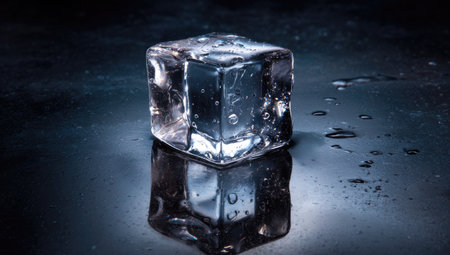 Chilled ice cubes glistening on dark surface offer refreshing coolness for summer drinks and beverage promotions