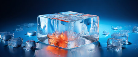 Crystal clear ice cube on dark blue background