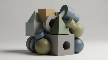 A collection of matte gray geometric shapes including spheres, cubes, triangles, and rings are arranged in a balanced composition with soft studio lighting casting...