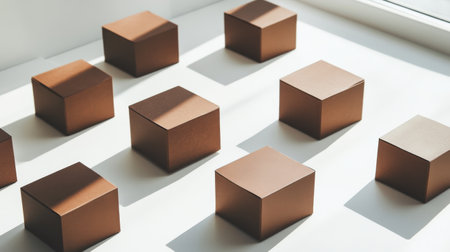 Geometric arrangement of brown cubes with sunlight and shadows. Minimalist design concept
