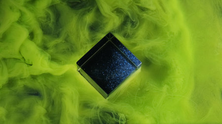 Steam flow. Ink water. Green acid neon color occult smoke curve wave wrapping shiny black cosmic cube form abstract background free space.