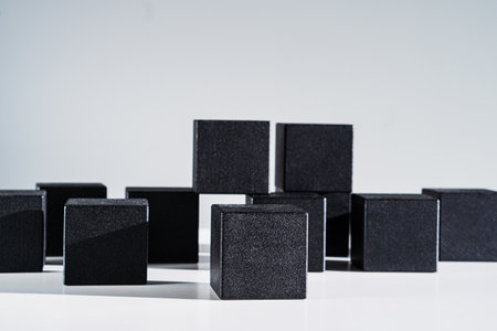 minimalist black cubes arranged in a symmetrical pattern, with soft shadows on a light gray surface.