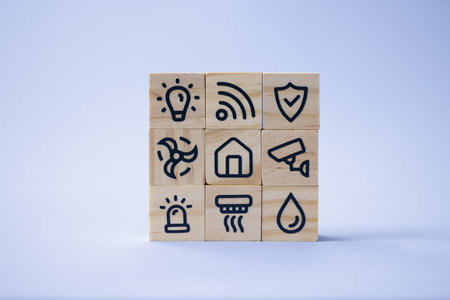 Innovative Technology: Man's Hand Holding Wooden Blocks Representing Smart Home Automation and Security in Digital Era.