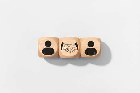 Agreement, partnership or deal concept. People and handshake Icons on wooden blocks isolated on gray background