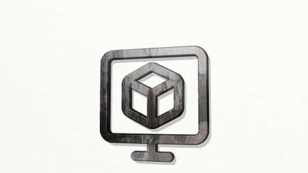 shipment online monitor made by 3D illustration of a shiny metallic sculpture on a wall with light background. delivery and cargo