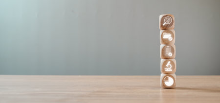 wooden block Add symbols for product manufacturing process, manufacturing guidelines and procedures, product planning process, business concept.