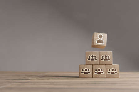 Human resources management business build team concept. Red colour leader. Wooden cube blocks with icon.