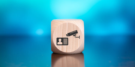 Wooden cube block shape with icon law legal justice. Law business and justice banner. Modern stacking cube block design with court, scale and justice symbols on smart dark background and copy space.