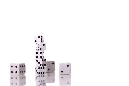 Stack of five white dice and Scattered dice of different sizes reflected in table surface isolated on white background copy space