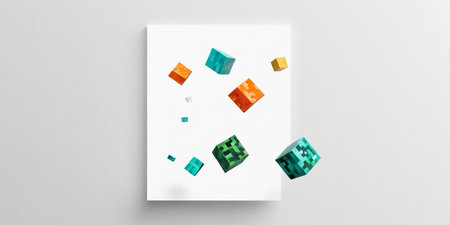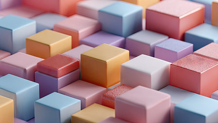 A modern abstract design of scattered colorful cubes on a soft white surface, with gentle light emphasizing the different textures of each cube.