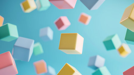 Floating pastel-colored cubes on blue background, geometric abstract concept