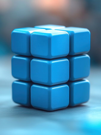A close-up of a blue cube made of nine smaller cubes, set against a blurred background. The soft lighting highlights the smooth texture and rounded edges.